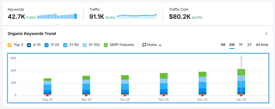 The results show strong growth: organic clicks reached 34.8K over the last six months, with impressions exceeding 4.51M. Keyword coverage expanded to 42.7K+ keywords, driving 100K+ organic traffic. Domain authority improved through 2.2K referring domains and 29K backlinks, while average rankings strengthened across high-intent search terms.